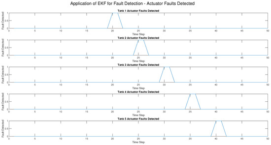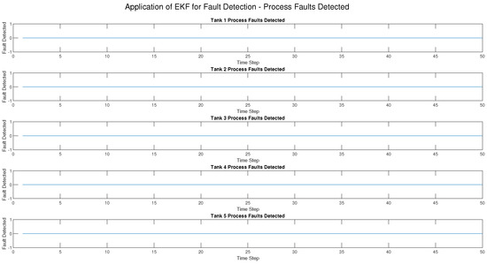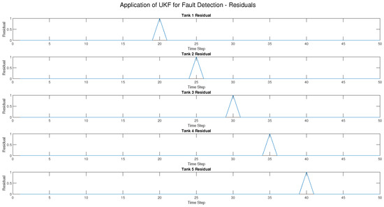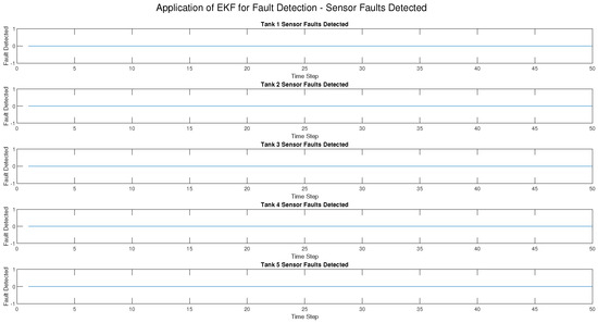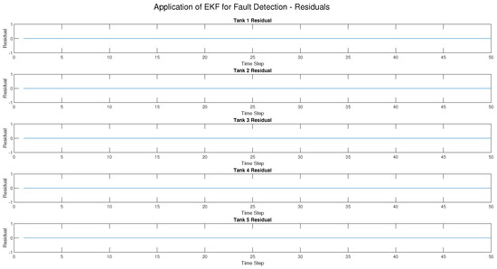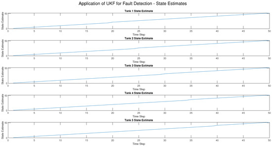 Three types of faults—sensor faults, actuator faults, and process faults—were introduced into the five-tank CIP system at various times in this research to evaluate how well the Extended Kalman Filter (EKF) as shown in Figure 3, Figure 4, Figure 5, Figure 6 and Figure 7 and the Unscented Kalman Filter (UKF) in Figure 8, Figure 9, Figure 10, Figure 11, Figure 12 can detect them. The results indicated a distinct difference between the two approaches in accuracy, detection speed, and robustness.