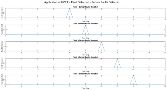 For the UKF, the result was a 100% True Positive Rate (TPR) across all fault types, i.e., all injected faults were detected. Moreover, the False Positive Rate (FPR) was very low (2.04%) and only occurred in actuator fault detection, which means there were very few classification errors. Most importantly, the UKF suffered no detection delay, i.e., faults were detected at the exact time of occurrence. In addition, the RMSE for all tanks was kept at 0.1414, showing that the UKF gave very precise state estimations despite the presence of faults.