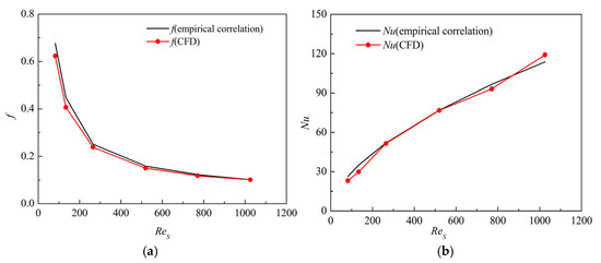 The comparison between the calculated results and empirical correlation: (a) f; (b) Nu.