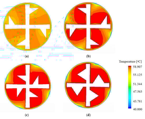 Temperature fields of tubes fitted with CVs at L = 0.312 m and Re = 202: (a) CVCP; (b) CVAP; (c) CVAC; (d) CVAD.