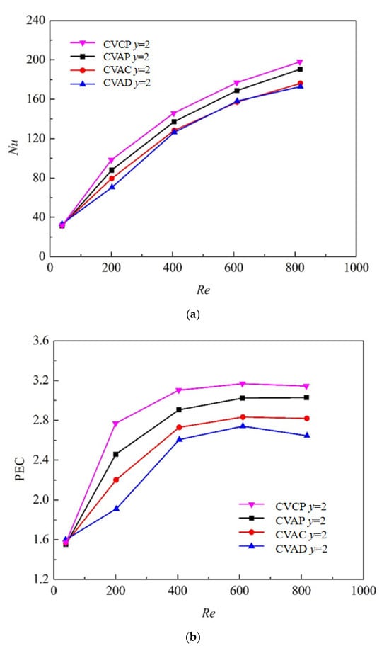 Nusselt number and PEC curves of tubes with inserted CVs in relation to Reynolds number (y = 2, α = 0°): (a) Nu; (b) PEC.