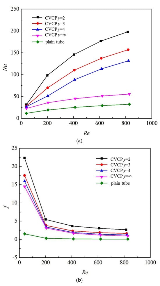 Nu and f curves of tubes with inserted CVCP with different y as a function of Reynolds number (α = 0°): (a) Nu; (b) f.