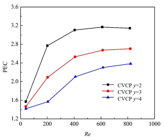 PEC curves of tubes with inserted CVCP with different y as a function of Reynolds number (α = 0°).
