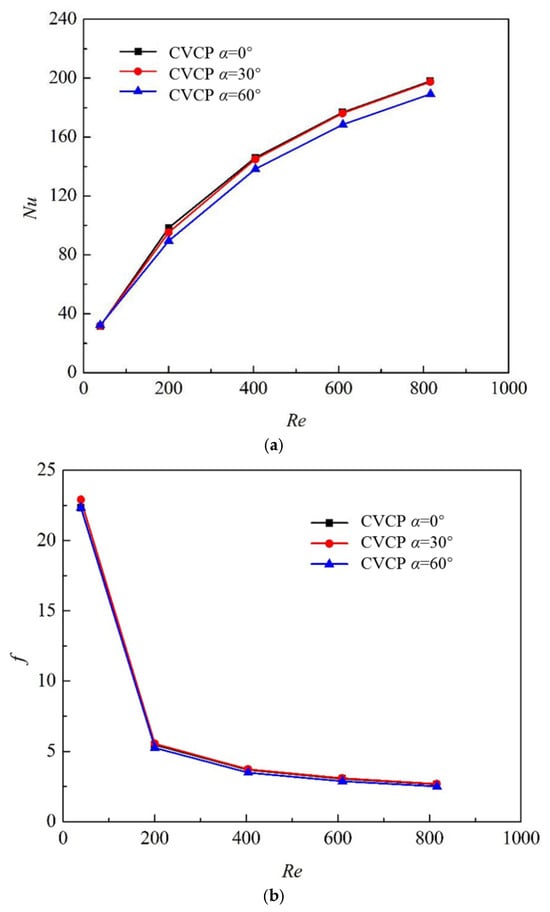 Nu and f curves of tubes with inserted CVCP with different α as a function of Reynolds number (y = 2): (a) Nu; (b) f.