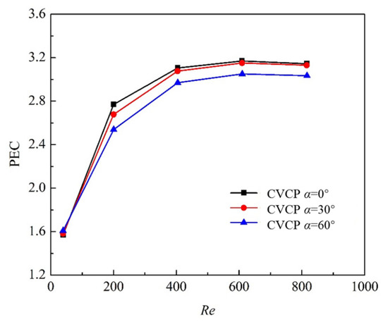 PEC curves of tubes with inserted CVCP with different α as a function of Reynolds number (y = 2).