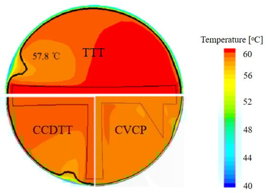 Studies indicate that the CVCP with y = 2.0 and α = 0° achieves the highest heat transfer enhancement. Therefore, we selected CVCPs for comparison with CCDTTs and traditional TTTs. Figure 13 displays the isothermal lines of 57.8 °C in the cross-sectional temperature field, taken 312 mm from the inlet at Re = 412 and y = 2.0. The results show that the lubricating oil temperature in the CVCP-equipped tube is lower than that in the TTT and CCDTT tubes, with a more uniform temperature distribution. For example, the average cross-sectional temperatures are 58.61 °C for the CVCP-inserted tube, 59.53 °C for the TTT, and 58.85 °C for the CCDTT.
