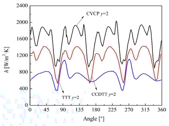 Compared to TTTs and CCDTTs, the CVCP-equipped tube has a more uniform temperature distribution, resulting in a steeper temperature gradient and a thinner thermal boundary layer. To quantify the thermal boundary layer changes, Figure 14 shows the distance from the 57.8 °C isothermal line to the wall as a function of the circular angle. At a twist ratio of 2.0, the distance trend for the CVCP-inserted tube is more moderate than that for the CCDTT and TTT. However, the maximum height of the CVCP is the smallest. Specifically, the average distance between the isotherm and the wall is 0.2 mm for the TTT-inserted tube, 0.12 mm for the CCDTT, and just 0.1 mm for the CVCP.
