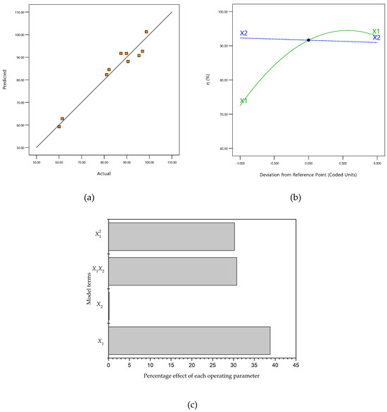 The adequate precision value of 14.516 suggests that the model had a sufficient signal-to-noise ratio, as values greater than 4 indicate that the model can effectively navigate the design space [42]. Furthermore, the coefficient of variance of 4.85% was lower than 10%, indicating the model’s high reproducibility and suitability for assessing the optimal operating variables.