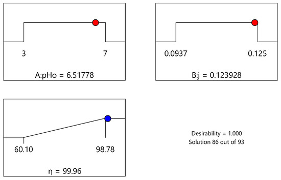 The modeling and optimization of the electro-oxidation process were conducted using response surface methodology (RSM), as outlined in Section 2.5. This approach was applied to evaluate the effect of the independent variables, initial pH (pH0) and applied current density (j), and the effect of the interactions between these variables on the response (η). RSM was also used to identify the optimal operating conditions for the process.