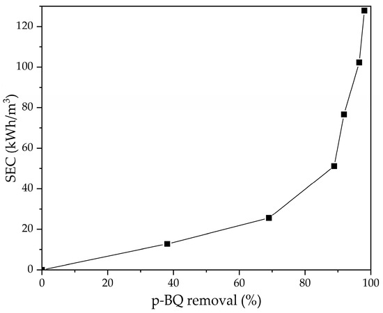 Specific energy consumption (SEC) as a function of p-BQ removal efficiency. At a pH0 of 6.52 and a j of 0.124 A/cm2, with a 5 h electrolysis duration.