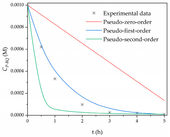 Plot of kinetic reaction models for p-BQ removal. pH0 of 6.52, j of 0.124 A/cm2, and electrolysis duration of 5 h.