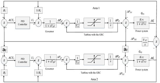 As shown in Figure 2, the investigated structure includes two interconnecting electrical networks comprising non-reheat thermal plants. The frequency of each area is governed by the swing equation, where deviations arise due to load disturbances. The power system dynamics are represented using state-space modeling, incorporating governor, turbine, and system inertia effects. The GRC limits the rate at which thermal generators can adjust power output, which is typically 2–5% per minute. This framework is widely used in the scientific literature for the development and investigation of automated load frequency problems of linked regions [,,,,]. The remaining parameters of system are the same as those mentioned in Appendix A [,,,,].