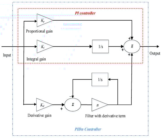 Under dynamically changing system states, PID controllers are among the most effective controllers [,,]. PID controllers are, therefore, used for both of the regions of the model under consideration. Figure 3 provides a description of the PID structure. The derivative term is filtered in order to reduce the input signal’s noise effect. Equations (1) and (2), correspondingly, could be used to characterize the transfer functions of PI and PIDn.