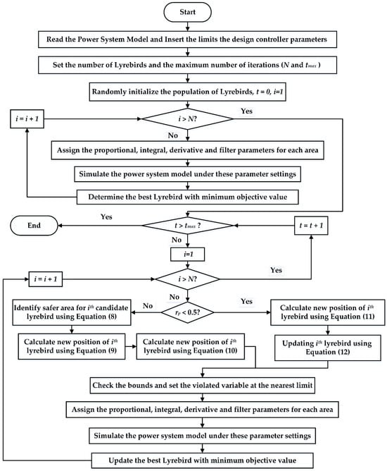 Here, t is the present iteration,  is the new position that is determined for the ith lyrebird that is totally reliant on the strategy proposed by the LOA optimization approach,  is its jth dimension,  is its fitness function’s value, and “t” is called the iteration counter. The LOA steps are illustrated in Figure 4. The LOA was employed in this study to optimize PIDn controller parameters for LFC in a multi-area power system. The primary objective of the optimization process was to minimize frequency deviations and improve the dynamic response of the power system following disturbances. The ITAE was chosen as the objective function as formulated in Equation (5) because it effectively penalizes larger deviations over extended time periods, ensuring a faster and smoother system response.