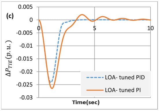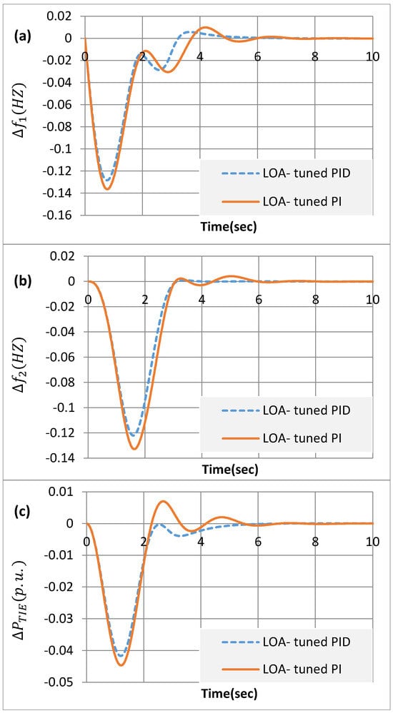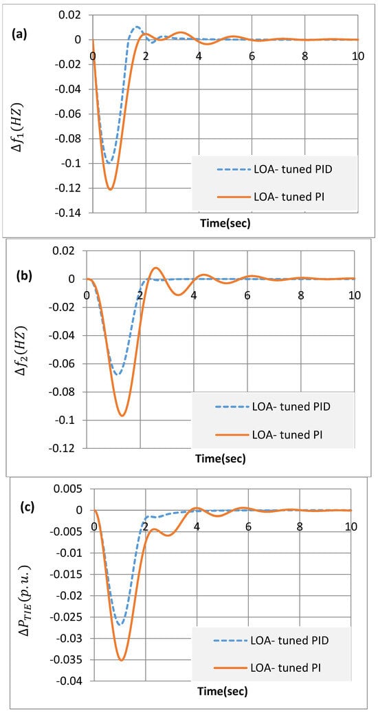 The tabulated results confirm the superiority of the LOA-tuned PID since it achieves a minimum ITAE value of 0.5841 as opposed to the ZN, GA, BFOA, FA, hFA–PS and TLBO-tuned IDD/PIDD results of 3.4972, 2.4668, 1.5078, 0.8023, 0.7405, 0.7400 and 0.6798, respectively. Additionally, the LOA-tuned PI controller achieves an ITAE value of 0.732. Furthermore, it outperforms other prior optimization methods in terms of settling time for frequencies and tie-line power deviations. The dynamic responses for tie-line power under the ITAE and frequency fluctuations in each jurisdiction are also displayed in Figure 7. The suggested LOA-tuned PIDn controller behaves better in terms of frequency deviations in each area and its tie-line power dynamic performance than the LOA-tuned PI controller, as illustrated in Figure 7.