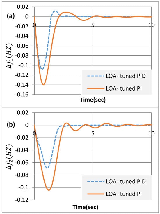 Here, a 5% SLI in area 1 with a concurrent 2% SLI in area 2 and a GRC = ±0.05 were addressed. Table 3 illustrates the related outcomes of the LOA-based PI/PID controllers regarding the settling times’ optimum control for each area and the ITAE. The table indicates the improved capabilities of the suggested LOA-tuned PIDn controller since it gives a minimal ITAE reading of 0.2245 and settling frequency times and transferred power changes of 2.2573, 2.7583, and 2.7862, respectively, in contrast to the LOA-tuned PI controller with an ITAE of 0.5442 and settling frequency times and transferred power changes of 4.7414, 7.2896, and 7.6936, respectively. Additionally, the responses for the deviations in area frequencies and transmitted power are demonstrated in Figure 6. The proposed LOA-tuned PIDn controller is in fact more effective at enhancing the power system’s damping characteristics than the LOA-tuned PI controller in terms of area frequencies and transmitted power.