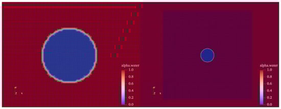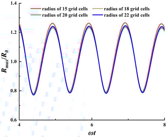 In this study, a three-dimensional single bubble model and a two-dimensional bubble cluster model were constructed, both employing orthogonal uniform grids. The domain size was set to be an order of magnitude larger than 5 wavelengths of the ultrasound. This configuration allows sound waves from multiple ultrasound cycles to propagate simultaneously within the domain, which is essential for accurately capturing the dynamics of the ultrasound field during the simulation. Additionally, considering computational efficiency and accuracy, a successive grid refinement strategy was applied to the square region surrounding the bubble. The refined grid around the bubble is depicted in Figure 1. It can be seen that the initial bubble radius is represented by approximately 20 grid cells, which meets the grid independence requirement, as shown in Figure 2. It can be observed that when the number of grid cells occupied by the bubble radius exceeds 18, the grid does not influence the simulation results.
