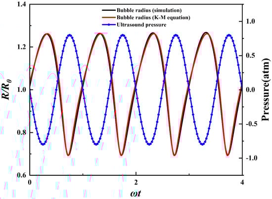 The R–P (Rayleigh–Plesset) and K–M (Keller–Miksis) equations [26] are the main equations used to describe bubble dynamics. Since this study primarily focuses on bubble oscillations in a periodic acoustic field, while considering factors such as acoustic radiation effects, fluid viscosity, surface tension, and fluid compressibility, the more suitable K–M equation is used for validation in this section.