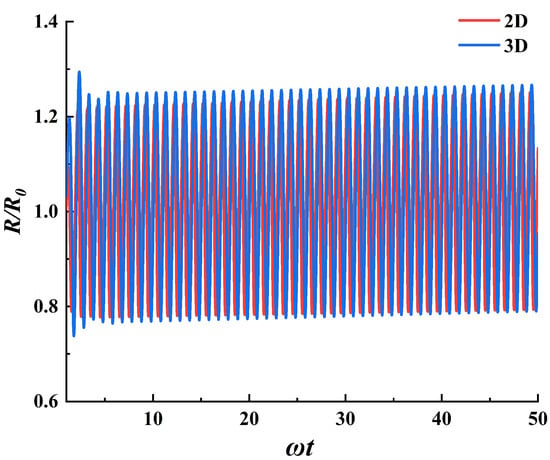 In addition, due to computational resource limitations, a two−dimensional model was chosen for the bubble cluster simulation in this study. To compare the differences between the two−dimensional and three−dimensional models, ultrasonic stable cavitation calculations were performed on the bubbles under identical conditions, and the results are shown in Figure 5. It can be observed that the two−dimensional model exhibits the same trend and oscillation period as the three−dimensional model. At the same time, the difference in bubble amplitude is approximately 2%. Therefore, this study selected a two−dimensional model for calculation and performed a qualitative analysis of the obtained data.