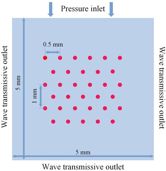 A two−dimensional simulation was developed to simulate the evolution of stable cavitation in a bubble cluster under ultrasound excitation, as illustrated in Figure 6. The flow domain is a square of 5mm side length, with the red circular regions representing cavitation bubbles, each with an initial radius of 1.5 μm. These bubbles are arranged in a staggered configuration with a void ratio. Meanwhile, in order to make the description of the bubbles more accurate, the first bubble in the first row is named Bubble 1–1, the second bubble in the first row is named Bubble 1–2, and so on.