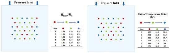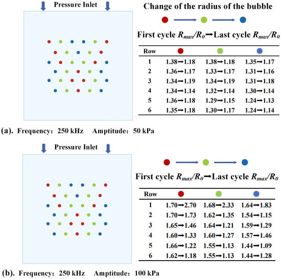 Figure 7 illustrates the distribution of the maximum bubble radius at an ultrasound frequency of 250 kHz with varying pressure amplitudes. The flow domain displays the volume variation distribution of bubbles across each row. Bubbles in the same row are arranged in descending order based on their maximum radius in the first few cycles and are represented by red, green, and blue colors, respectively. The bubbles displayed in red are the ones with the largest amplitude variation among the same row. Additionally, the accompanying table provides the ratio of the maximum bubble radius to the initial bubble radius, /, for bubbles in each row during both the first few cycles and the last few cycles of cavitation.