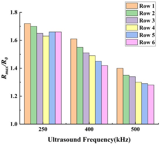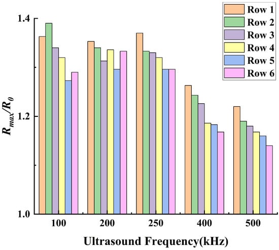 Figure 10 shows the average amplitude of bubbles in each row at different ultrasound frequencies, with an acoustic pressure amplitude of 50 kPa. It can be observed that when the ultrasound frequency exceeds 250 kHz, the higher the ultrasound frequency, the smaller the oscillation amplitude of the bubbles in each row. Since the bubbles are driven by acoustic pressure, this suggests that acoustic attenuation occurs within the flow field. The higher the ultrasound frequency, the greater the attenuation of acoustic pressure over the same propagation distance.