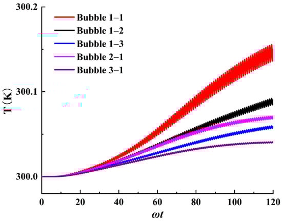 When the ultrasound frequency is 250 kHz and the amplitude is 100 kPa, the representative temperature changes in the bubble domain are shown in Figure 13. It can be observed that the temperature in the bubble domain follows a fluctuating upward trend. During the initial stage, the rate of temperature increase accelerates, while in the middle stages, the rate slows and eventually stabilizes. Additionally, the temperature oscillation period within the bubble flow region corresponds to the ultrasound cycle, indicating that each stable cavitation cycle contributes to a consistent temperature increase. The synchronization of temperature fluctuations with ultrasound is related to the thermodynamic processes of bubble oscillation: when bubbles are subjected to positive pressure, their volume decreases, causing an internal temperature rise and initiating heat conduction. Simultaneously, viscous effects in the liquid generate internal energy, leading to a rapid increase in liquid temperature.