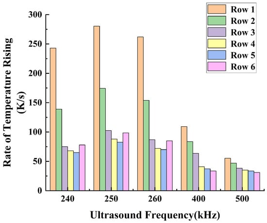 Furthermore, when the acoustic pressure amplitude is 100 kPa, the average temperature rise rate of bubbles in each row under different ultrasound frequencies is shown in Figure 17. It can be observed that when the acoustic pressure amplitude exceeds 100 kPa, the temperature rise rate in the bubble flow region significantly increases. Meanwhile, when the ultrasound frequency is 400 kHz and 500 kHz, the temperature rise rate varies more between the rows of bubbles, indicating more severe acoustic attenuation. Additionally, compared to ultrasound frequencies of 240 kHz and 260 kHz, the temperature rise rate in the bubble flow region is fastest when the ultrasound frequency is 250 kHz.