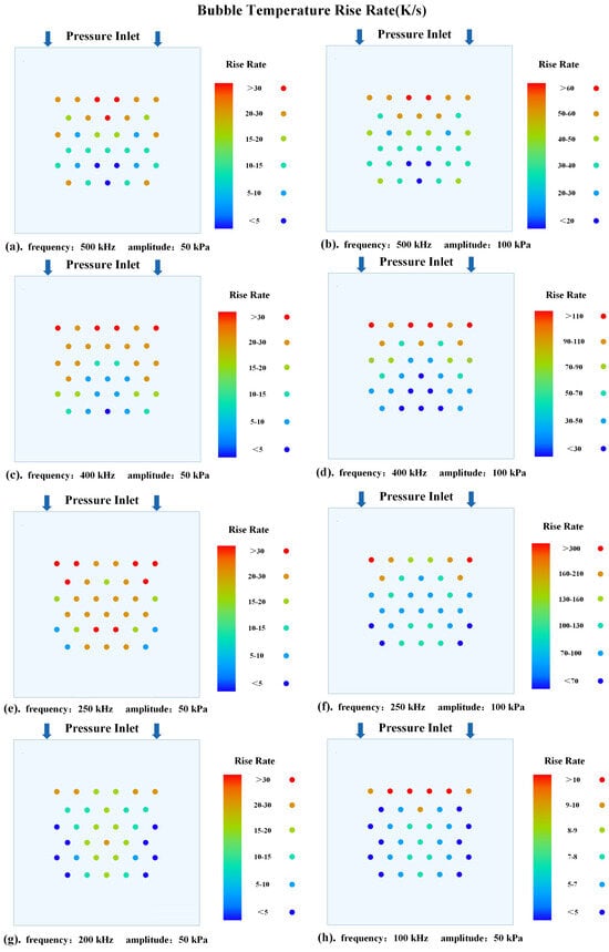 Similarly, when the acoustic pressure amplitude is increased to 100 kPa, the distribution of temperature rise rates is shown in Figure 18b,d,f. In the figure, the average temperature rise rate of bubbles is ranked respectively. The left side displays the distribution of temperature rise rates, while the right side provides the rise values. It can be observed that the regions with a faster temperature rise at 50 kPa still experience a faster temperature rise at 100 kPa. The change in acoustic pressure amplitude does not affect the acoustic focusing region formed by acoustic scattering. Simultaneously, a comparison of Figure 18a,c,e,g,h reveals that as the ultrasound frequency decreases, the energy within the flow field becomes more concentrated towards the interior of the flow domain. These observations are consistent with the changes in bubble oscillation amplitude.