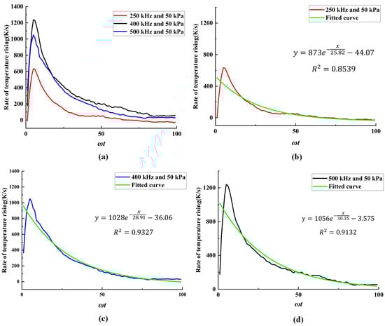The liquid phase temperature rise rate under different ultrasound conditions is shown in Figure 19a, where the liquid temperature is taken as the average of multiple probe temperatures at the center of the flow domain. It can be observed that, under different ultrasound conditions, the amplitude of the liquid phase temperature rise rate varies, but the trend remains the same. During the initial few ultrasound cycles, the temperature rise rate increases rapidly and peaks around the tenth cycle, with a maximum rate of up to 1250 K/s. In the early stages of cavitation, when bubble stable cavitation has not yet stabilized, the impact on the internal temperature of the bubbles is significant. After that, the temperature rise rate decreases sharply and gradually slows down after more than fifty cycles, with the rate of deceleration also decreasing. Eventually, it stabilizes and remains at a constant rate. This trend is consistent with the temperature variation pattern in the bubble field shown in Figure 13.