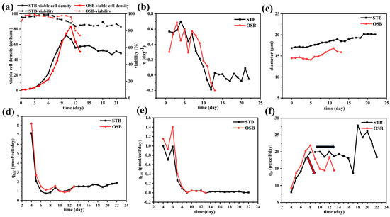 Time profiles of (a) viable cell density (cells/mL) and cell viability (%); (b) specific growth rate (day−1); (c) average cell diameter (μm); (d) specific glucose consumption rate (pmol/cell/day); (e) specific lactate production rate (pmol/cell/day); and (f) specific antibody production rate (pg/cell/day) during perfusion culture of the OSB (red) and STB (black).