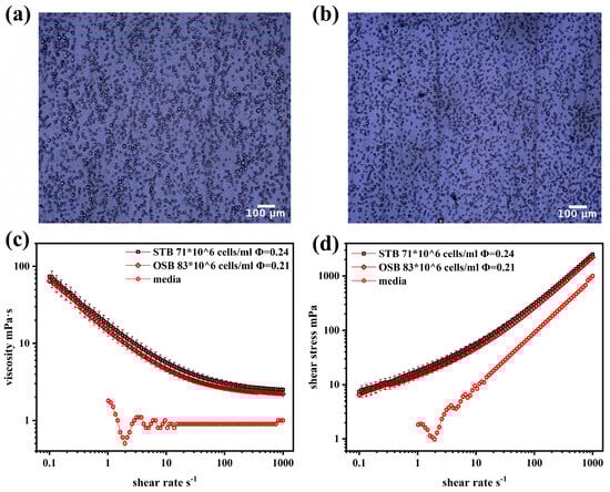 Previous studies have shown that both biconcave disc-shaped erythrocyte suspensions and spindle-shaped rat aortic smooth muscle cell suspensions exhibit shear-thinning rheological behaviour at high concentrations [12,14]. However, CHO cells differ significantly in morphology. As shown in Figure 2a,b, under maximum cell density conditions (dilution ratio of 1:10), CHO cells in both the STB and OSB appeared spherical, maintaining similar morphological features despite variations in cell density and diameter.