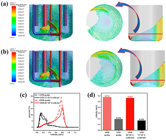 Comparison of flow field characteristics in the STB and OSB: (a) velocity vector-superimposed contour plots in fresh medium; (b) velocity vector-superimposed contour plots in cell suspension at maximum density; (c) volume distribution proportion across velocity intervals; and (d) volume-averaged velocity analysis.