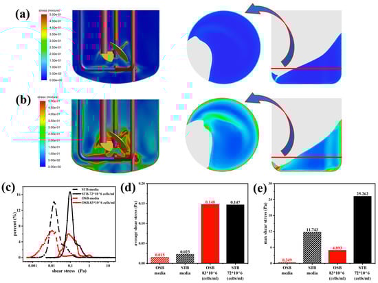 Comparative analysis of shear stress distributions between the STB and OSB: (a) shear stress contours in fresh culture medium; (b) shear stress contours in cell suspension at maximum density; (c) volumetric distribution across shear stress ranges; (d) volume-averaged shear stress; and (e) maximum shear stress analysis.