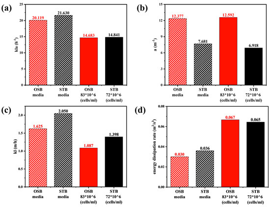 Variations in the rheological properties induced by increasing cell density significantly affected the mass transfer performance of the OSB and STB. As illustrated in Figure 6a, under identical fluid medium conditions, values in the OSB and STB were comparable. However, upon transitioning the working fluid from fresh culture medium to high-density cell suspensions, the value in both reactors decreased by approximately 30%. Given that is determined by both the gas–liquid interfacial area () and the liquid-side mass transfer coefficient (), and considering that the value of remained relatively constant during rheological changes (Figure 6b), the decrease in can be primarily attributed to the reduction in (Figure 6c).