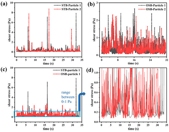 Temporal evolution of shear stress (’lifelines’) experienced by two randomly selected particles in the (a) STB and (b) OSB. (c) Comparison of the “lifeline” of particles in the two reactors, and (d) amplification of the 0–1 Pa range to observe the frequency of shear stress peaks in that range.
