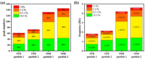 Quantification of shear stress peaks in the “lifeline” of cells using peak detection technology in signal processing, showing the (a) number of peaks and (b) frequency of peaks in different shear stress intervals. The numerical values within the bars represent the relative proportions or frequencies of the peaks within each range.