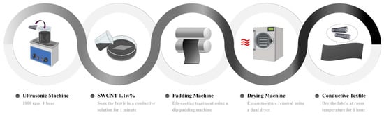 Figure 1 illustrates the process of fabricating conductive textiles from cotton fabrics through the SWCNT dip-coating process. The SWCNT ink was stirred at 1000 rpm for at least one hour using an ultrasonic processor to prevent the formation of air bubbles and ensure uniform dispersion on the fabric surface. The SWCNTs used in this study have a G/D ratio of over 80 and a diameter ranging from 1.1 to 1.4 nm. The fabric, composed of cellulose fibers, was immersed in a 0.1 wt. % water-based SWCNT solution for one minute, followed by the absorption of conductive particles using a dip-padding machine (Daelim Lab, Seoul, Republic of Korea). The excess moisture retained in the fabric was subsequently removed by drying at a temperature range of 70–80 °C for five minutes in a dual dryer (Daelim Lab, Seoul, Republic of Korea), where a circulation fan operated at 1500 rpm. Finally, the dried fabric underwent a stabilization process at room temperature for one hour. Through this process, SWCNTs were uniformly coated onto the fabric surface, resulting in the fabrication of conductive textiles with high electrical conductivity.