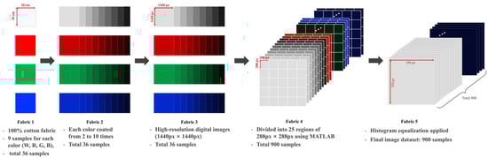 Notably, single-coating samples were excluded from the study due to their high coating non-uniformity, which led to inconsistent resistance values and inadequate surface treatment. From a practical application perspective, such samples would likely be considered defective, and thus, they were omitted from the analysis. To train the CNN model, the fabricated conductive fabrics needed to be converted into digital images. To minimize distortions caused by external light, shadows, and camera lens effects, a scanner was used to obtain high-quality resolution images (1440 pixel × 1440 pixel), which were designated as Fabric 3. In AI training, a sufficient quantity of data is crucial, as it significantly influences model prediction accuracy and performance. To expand the dataset, each Fabric 3 image was divided into 25 non-overlapping regions of 288 × 288 pixels using MATLAB R2023 software, yielding a total of 900 image samples. This approach was not only more efficient than physically cutting the fabrics, but it also prevented material damage and increased the applicability of the dataset across various sizes and shapes. Finally, the 900 segmented images, referred to as Fabric 4, underwent histogram equalization, forming the final dataset, Fabric 5. Histogram equalization redistributes the contrast within an image to enhance subtle grayscale patterns while effectively mitigating brightness inconsistencies caused by color variations. This preprocessing technique enables the CNN model to learn fine grayscale differences with greater precision while offering high computational efficiency and implementation simplicity. Accordingly, this study adopted the histogram-equalized Fabric 5 images as the final dataset (Table 1).