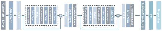 In this research, a ResNet-based CNN model was designed using 288 × 288 RGB images from the final dataset, Fabric 5, as input. The model was structured to effectively learn the intricate relationship between brightness and resistance in conductive fabrics. The convolutional layers were responsible for processing images and extracting features, employing 3 × 3 kernels to capture local patterns. Each residual block consisted of a convolutional layer, batch normalization, and a Rectified Linear Unit (ReLU) activation function. Batch normalization normalized data distribution, improving learning speed and stability, while the ReLU activation function introduced non-linearity by converting negative values to zero while preserving positive values, effectively alleviating the vanishing gradient problem and enhancing learning efficiency. To implement skip connections, an additional convolutional layer was included to align the dimensionality between input and output data. These skip connections combined input and output information, ensuring learning stability and facilitating effective training even in deep networks. Following the residual blocks, global max pooling was applied to reduce spatial dimensions and extract key features. Finally, a fully connected layer and regression layer were incorporated to predict the resistance values of conductive fabrics.