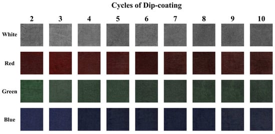 In this study, cotton fabrics (Holmes Fabric, Daegu, Republic of Korea) of four different colors (white, red, green, and blue) were prepared by laser-cutting each fabric into 9 pieces of 10 cm × 10 cm, resulting in a total of 36 samples, referred to as Fabric 1. Subsequently, to obtain a range of resistance values, dip-coating was performed with a specific number of repetitions (2, 3, 4, 5, 6, 7, 8, 9, or 10 cycles) on each of the nine samples for each fabric color.