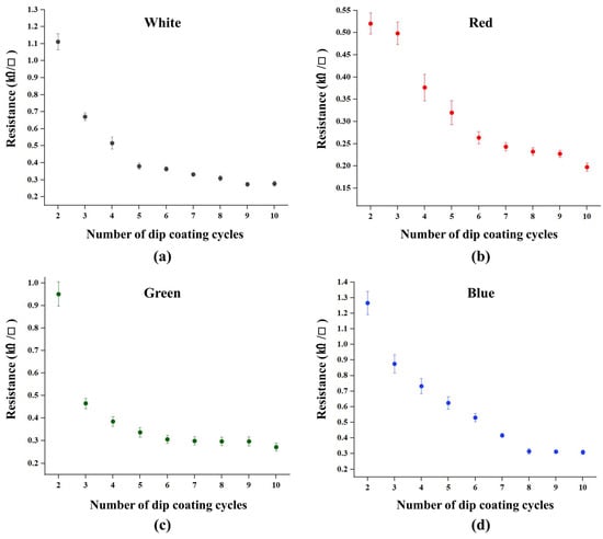 Relationship between dip-coating cycles and resistance for each fabric color: (a) white, (b) red, (c) green, (d) blue.