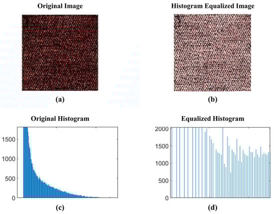 Comparison of fabric image and histogram distribution before and after histogram equalization: (a) Fabric image before histogram equalization, (b) Fabric image after histogram equalization, (c) Histogram before histogram equalization, (d) Histogram after histogram equalization.