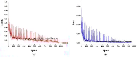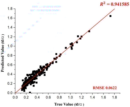The experiments in this study were conducted using MATLAB R2023 software on a system based on the Z790 AORUS ELITE motherboard, equipped with a 13th Gen Intel® Core™ i9-13900K processor (Intel Corporation, Santa Clara, CA, USA) (3.00 GHz), 32 GB of memory, and an NVIDIA GeForce RTX 4090 graphics card (driver version 536.40). For training the ResNet-based CNN model, the Adam optimization algorithm was utilized. The training conditions were set to a maximum of 50 epochs, a mini-batch size of 32, and an initial learning rate of 0.0005. To enhance training stability, the dataset was shuffled randomly at each epoch. Additionally, to evaluate model performance throughout training, validation data consisting of test images and their corresponding labels were used. Validation was conducted every five epochs to monitor model generalization and prevent overfitting. Figure 8 illustrates the variations in root mean square error (RMSE) and loss values during both training and validation. The figure demonstrates a steady decline in RMSE and loss, indicating that the model effectively learned from the data. Notably, the validation RMSE closely converged with the training RMSE, confirming that the ResNet model successfully trained without overfitting. The final training results yielded an RMSE of 0.0622 and a coefficient of determination (R2) of 0.9416. These results indicate that the ResNet model exhibited very low prediction error across the entire dataset, demonstrating stable performance. Given its ability to accurately capture the relationship between grayscale intensity and resistance, the model effectively learned the underlying patterns. Furthermore, the low RMSE and high R2 values suggest that the residual learning structure of the ResNet model successfully handled color variability and complex patterns within the data. Figure 9 presents a comparison between actual and predicted resistance values, demonstrating that the ResNet model’s predictions closely align with real values across most data points. This result confirms the high predictive accuracy of the proposed model. Furthermore, these findings indicate that the ResNet model can operate robustly even in datasets containing complex variables such as color variability.
