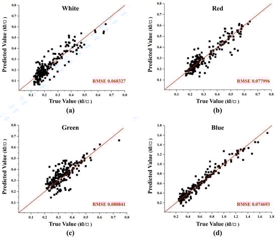 The prediction performances of the ResNet model for each fabric color recorded RMSE values of 0.0683, 0.0780, 0.0808, and 0.0747 for white, red, green, and blue fabrics, respectively. The white fabric exhibited the lowest RMSE due to the absence of color variability, which enhanced model training. Meanwhile, the red, green, and blue fabrics also demonstrated consistently low RMSE values, demonstrating that the ResNet model effectively accounted for color variability. Figure 10a–d visually illustrate the distribution of actual and predicted values for each fabric color. Although minor variations were observed across different colors, the ResNet model achieved stable and high prediction accuracy across all fabric types. Notably, the model demonstrated strong performance even when dealing with complex variables such as color variability, further validating the effectiveness of the proposed non-contact image-based resistance evaluation method.