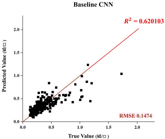 To compare with the performance of the ResNet model, a Baseline CNN model was designed and evaluated using the same dataset. The baseline CNN consisted of a relatively simple architecture comprising convolutional layers, max-pooling layers, fully connected layers, and a regression layer. To optimize performance, RMSprop was used as the optimization algorithm, along with a learning rate scheduling mechanism. The final RMSE of the baseline CNN was 0.1474, with an R2 value of 0.620103. This indicates that the baseline CNN failed to adequately capture the variability within the data, resulting in predictions that exhibit a weaker correlation with the actual values. Figure 11 presents the distribution of actual and predicted values for the baseline CNN, visually demonstrating that while the model learned the general patterns in the data, its predictive accuracy was limited when applied to complex datasets. In contrast, the ResNet model achieved lower prediction error, and demonstrated the ability to effectively capture grayscale pattern variations caused by color differences while maintaining high prediction accuracy. These results suggest that, compared to the baseline CNN, the ResNet model more effectively learns the data variability introduced by color differences, leading to more accurate resistance predictions. Furthermore, the findings confirm that the ResNet model surpasses the baseline CNN in handling data complexity, further reinforcing the effectiveness of the non-contact, image-based resistance evaluation method.
