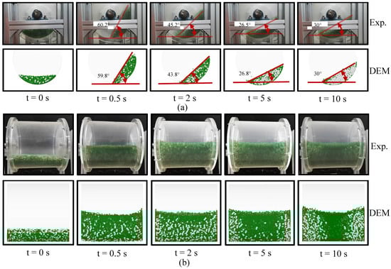 - Yu, F.; Zhang, S.; Zhou, G.; Zhang, Y.; Ge, W. Geometrically Exact Discrete-Element-Method (DEM) Simulation on the Flow and Mixing of Sphero-Cylinders in Horizontal Drums. Powder Technol. 2018, 336, 415–425. [Google Scholar] [CrossRef]