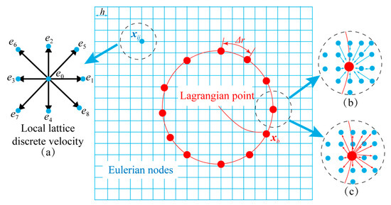 Figure 1. (a) A schematic of the discrete velocities of the lattice nodes in the flow field; (b) interpolating the unforced velocity from fixed Eulerian nodes to moving Lagrangian points; (c) distributing the calculated boundary force from Lagrangian points to Eulerian nodes.