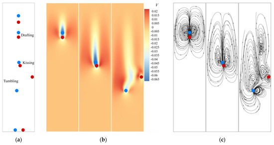 Figure 2. Drafting, kissing, and tumbling (DKT) model of pair of particles: (a) instantaneous positions; (b) velocity contours in y-direction; (c) streamline diagram.