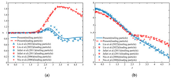 The DKT problem of two circular particles under gravity is used to verify the effectiveness of the method adopted in this paper. In a computational domain of 200 × 800 filled with stationary fluid, a circular particle with zero initial velocity is released at positions (100.9, 721) and (101, 681). Non-slip boundary conditions are applied to all walls in the computational domain. The important dimensionless number in particle sedimentation problems is the Archimedes number Ar = g D p 3 ρ p ρ f / ν f 2 ρ f [35]. In the calculation, the fluid density and viscosity are set to ρ f = 1.0 and ν f = 0.05 , respectively. The particle density and diameter are set to ρ p = 1.01 and D p = 20 , respectively. In this simulation, Ar = 28, and the gravitational acceleration is calculated to be g = 0.0245. It should be noted that, unless otherwise specified, the physical quantities in this paper are all taken in lattice units.